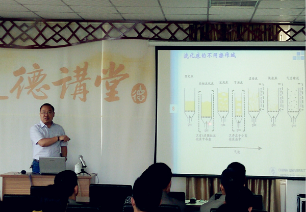 張教授首先講解了“氣-固流態(tài)化”基本概念,從理論的角度介紹了流態(tài)化過程對(duì)非均相反應(yīng)過程的影響及流化床不同的流化形式,其后張教授把流態(tài)化的相關(guān)知識(shí)由理論延伸到實(shí)際生產(chǎn)應(yīng)用,著重講解了在催化裂化中的應(yīng)用,并且講解了氣固分離設(shè)備和分布器在實(shí)際應(yīng)用中的作用。此外,還針對(duì)催化裂化裝置常見的催化劑跑損、設(shè)備磨損等問題進(jìn)行了深入分析。