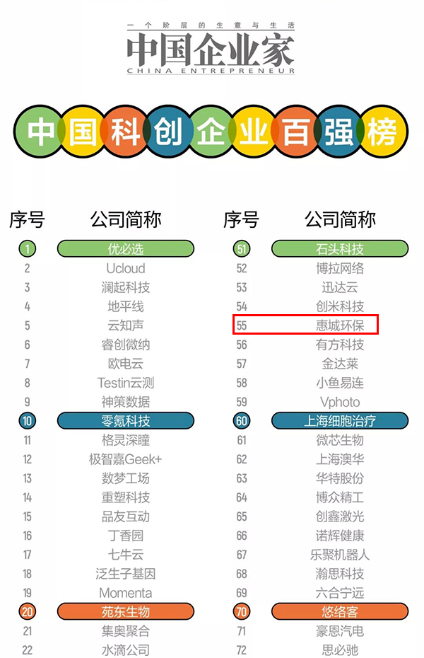 近日,《中國企業(yè)家》發(fā)布“科創(chuàng)企業(yè)百強榜”,我公司青島惠城環(huán)保科技股份有限公司位列其中。